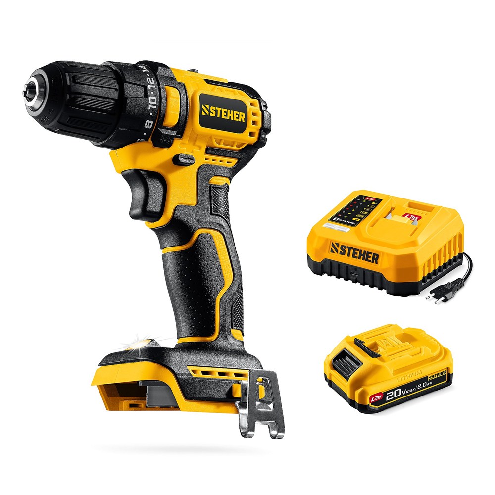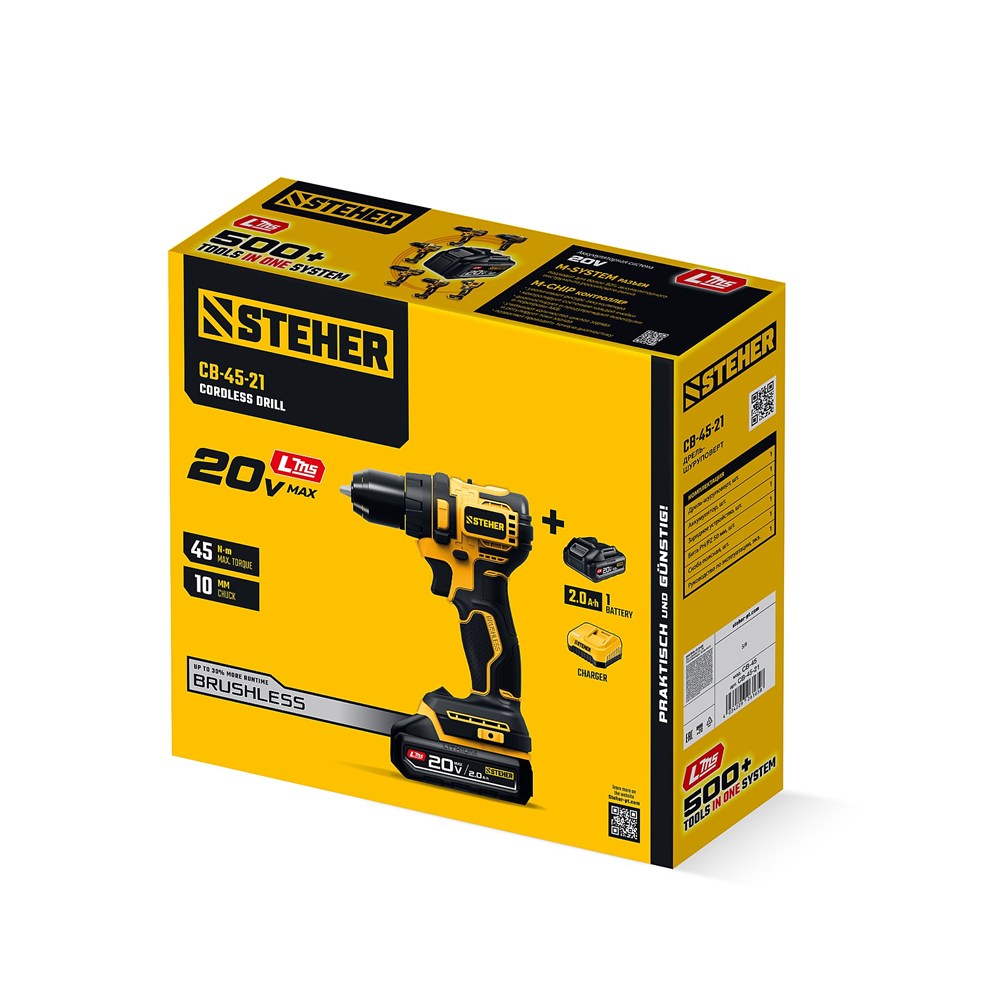 STEHER 20 В, 45 Н·м, 1 АКБ LMS (2 А·ч), бесщеточная дрель-шуруповерт (CB-45-21)