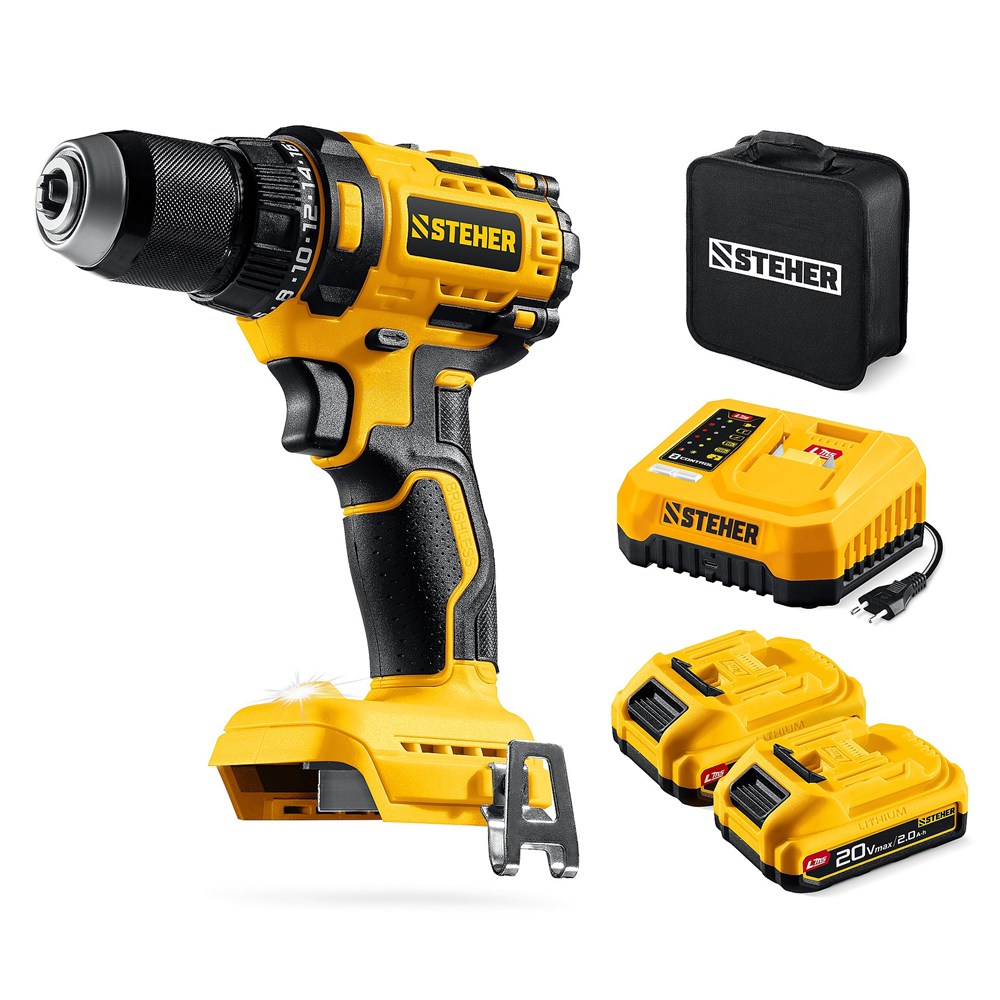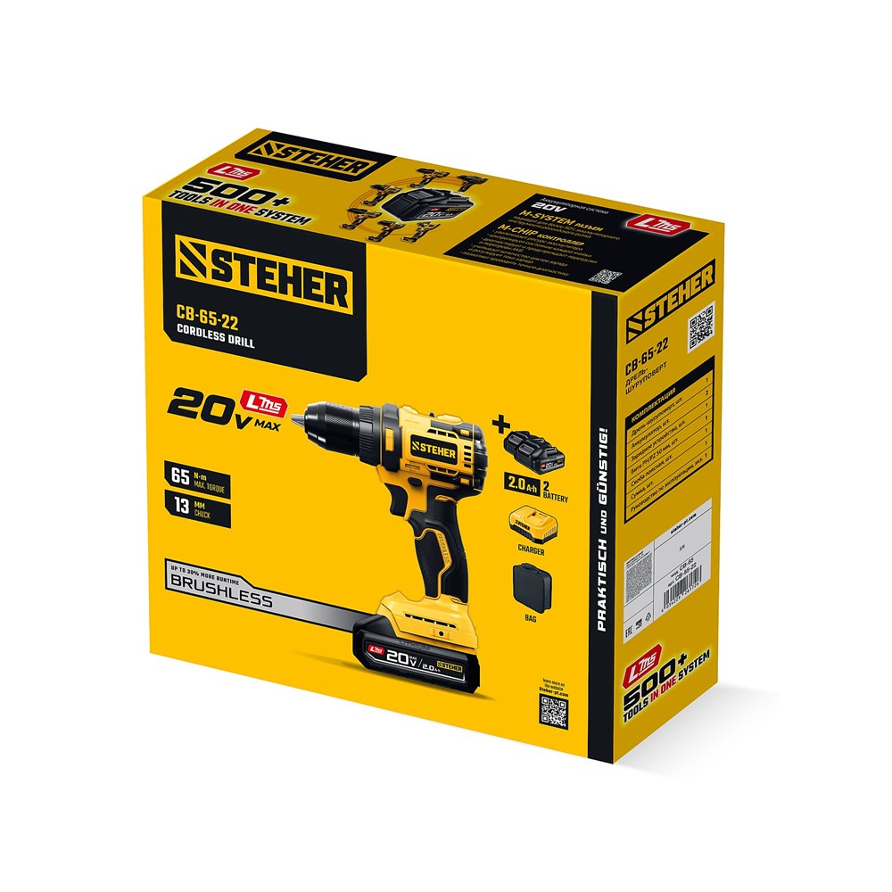 STEHER 20 В, 65 Н·м, 2 АКБ LMS (2 А·ч), бесщеточная дрель-шуруповерт, сумка (CB-65-22)