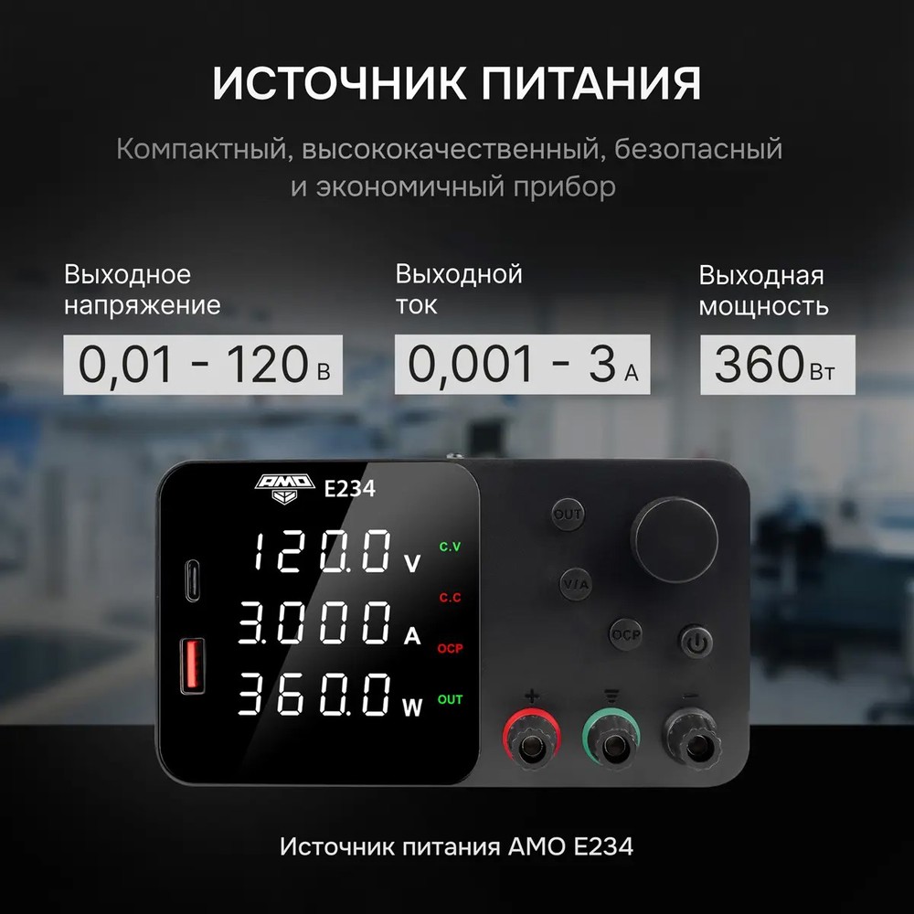 Источник питания AMO E234 разработан для специалистов, которым необходим стабильный и регулируемый источник высокого напряжения. С диапазоном от 0,01 до 120 В при токе до 3 А и мощностью до 360 Вт, он подходит для испытаний изоляции, питания электронно-лучевых трубок, тестирования высоковольтных модулей и обучения в технических вузах. Три цифровых дисплея одновременно показывают напряжение, ток и мощность, что устраняет необходимость в дополнительных измерительных приборах.
