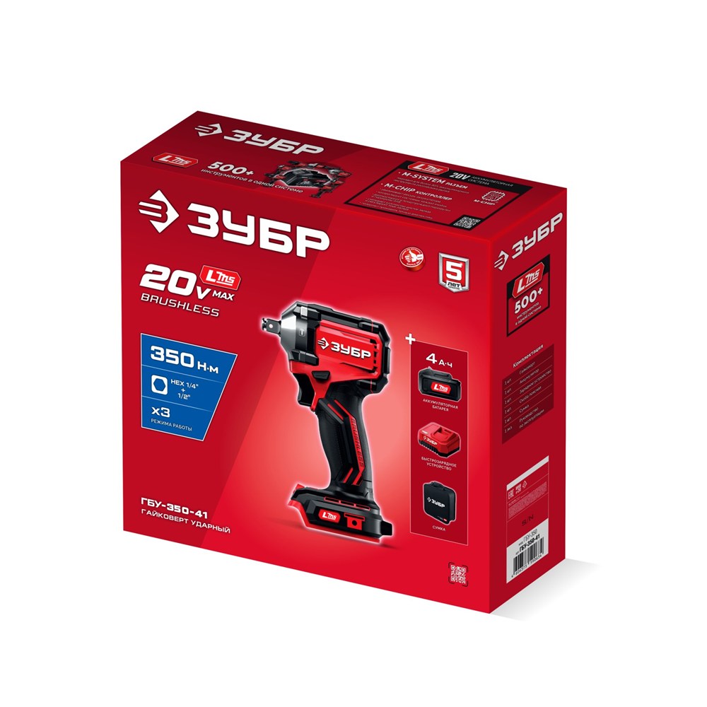 ЗУБР 20 В, 350 Н·м, 1 АКБ LMS (4 А·ч), бесщеточный ударный гайковерт, сумка (ГБУ-350-41)