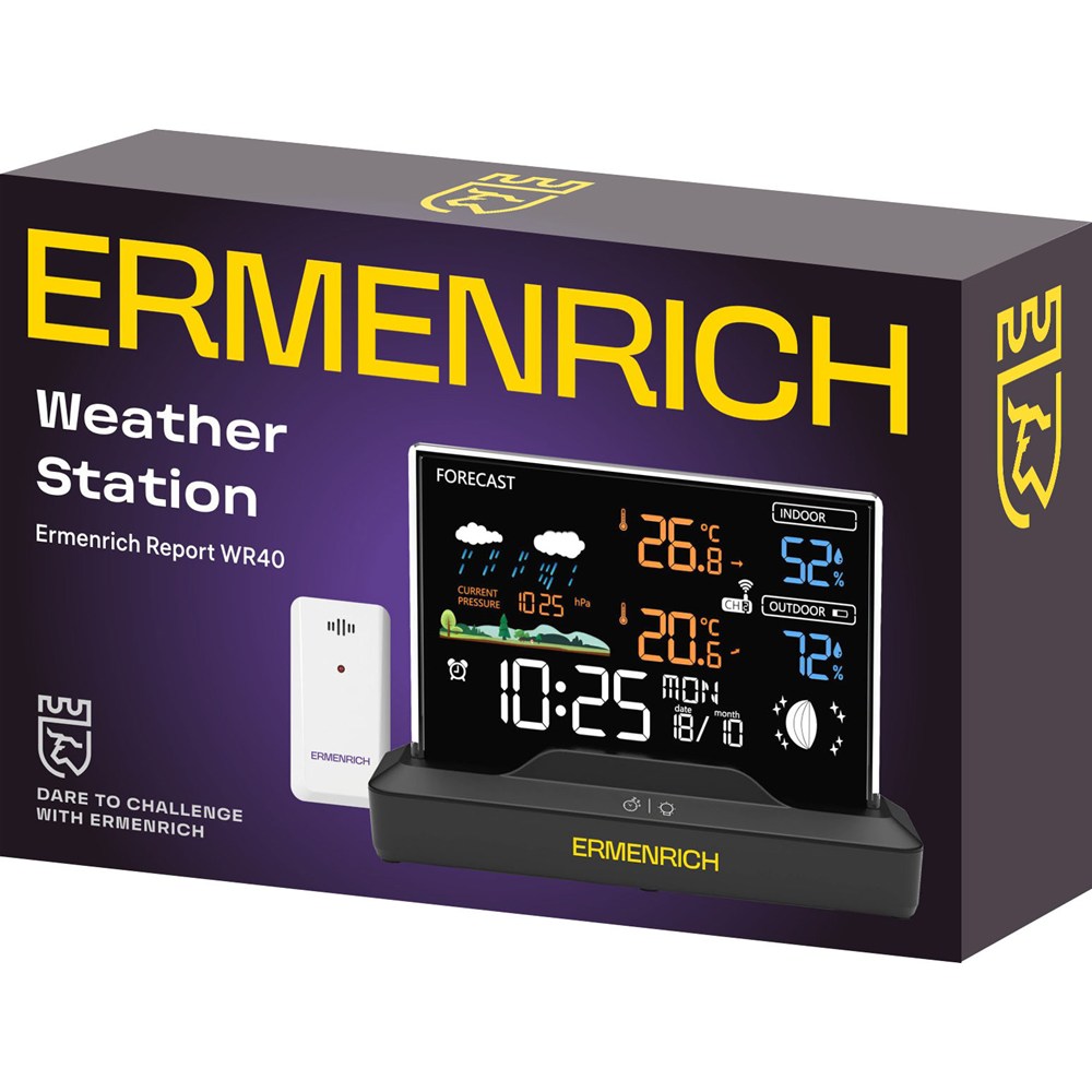 Метеостанция от бренда Ermenrich модели Report WR40 – это домашний прибор, предназначенный для использования всей семьей, когда необходимо узнать текущую погоду, уровень влажности воздуха, время или день недели. Он оснащен ярким цветным экраном, работающим на основе жидкокристаллической VA-матрицы с высокой контрастностью, на котором отображается информация о всех наиболее важных показателях окружающей среды: температуре и влажности на улице и дома, текущем атмосферном давлении, прогнозе погоды и даже фазе Луны. Метеостанцию можно поставить на прикроватную тумбу и использовать в качестве будильника – встроенные часы имеют и эту функцию.